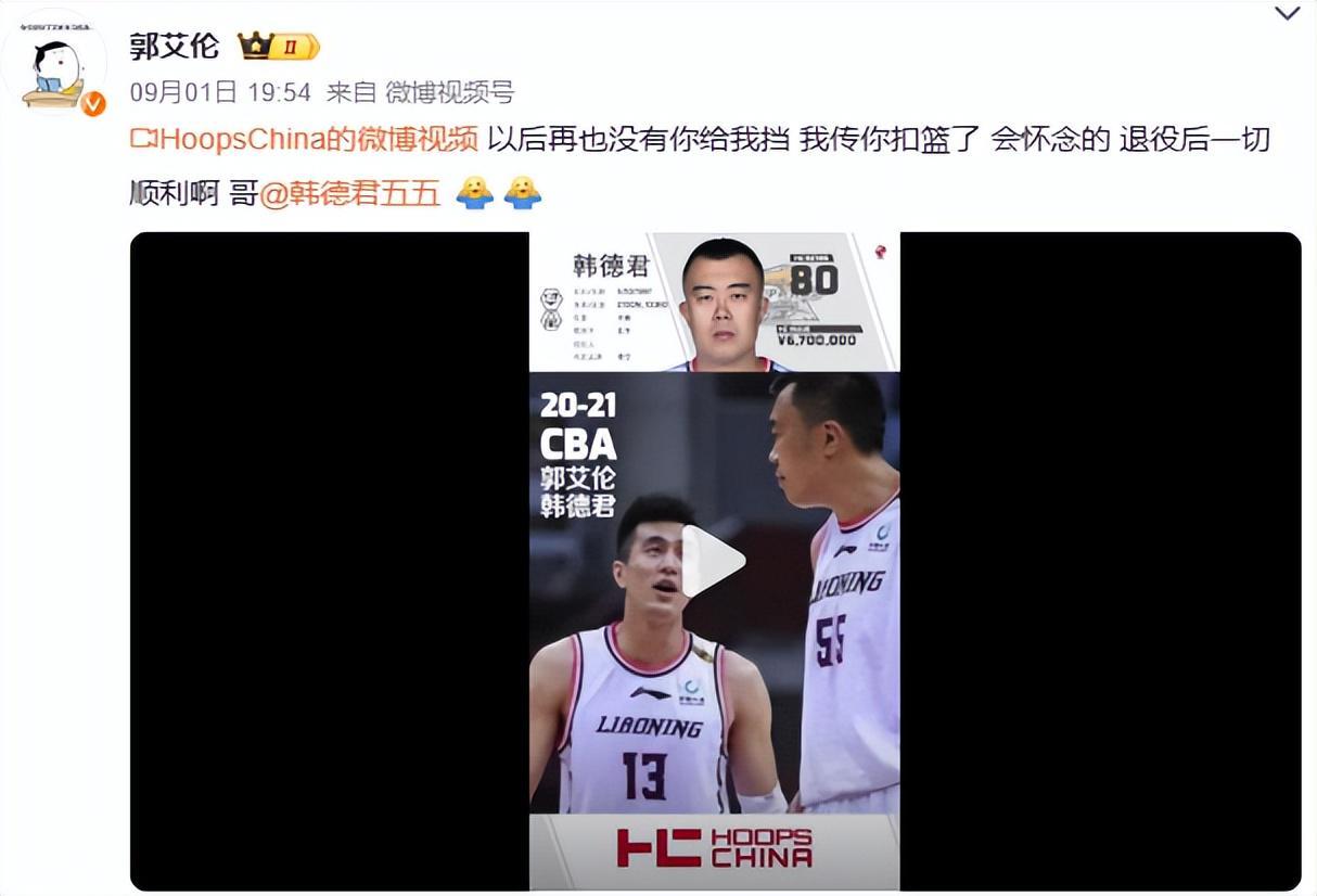对于老队友的退役,郭艾伦第一时间发文送上祝福:“以后再也没有你给我挡,我传你扣篮了,会怀念的,退役后一切顺利啊哥。”