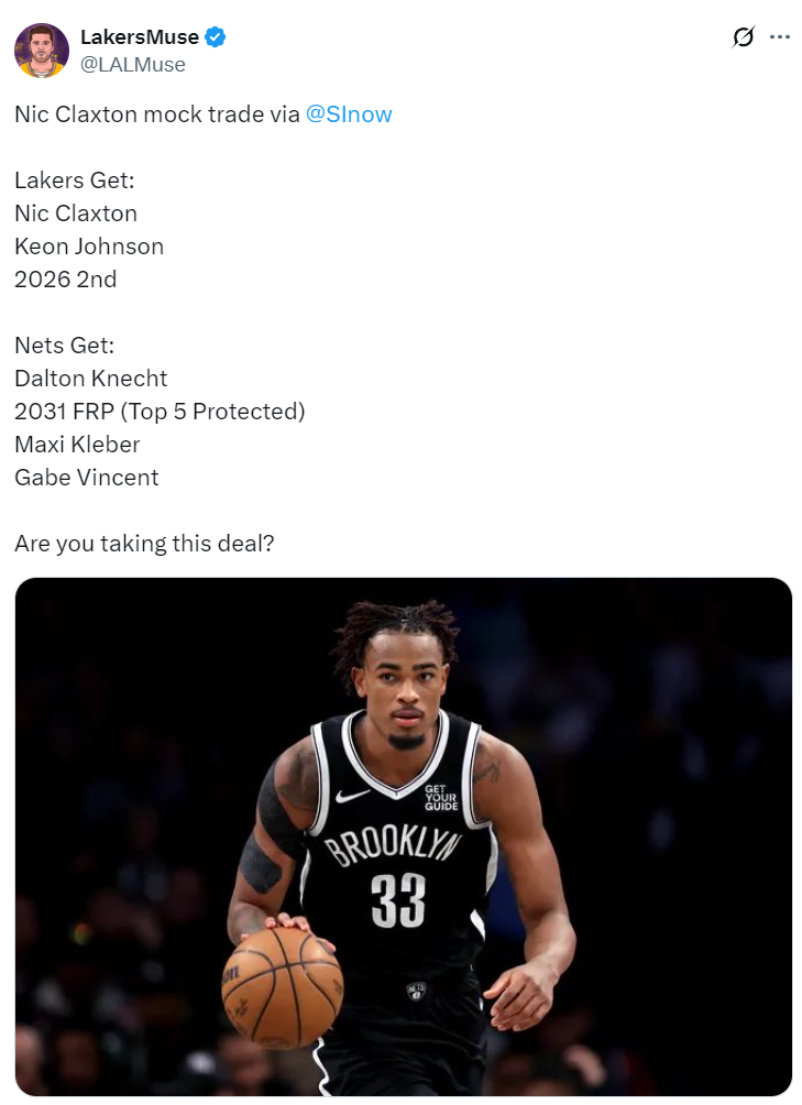 湖人得到:克拉克斯顿、基恩-约翰逊、2026年篮网次轮。这笔交易后湖人不仅得到一个先发五号位,还得到了一个身高1.93米的板凳席砍分手。