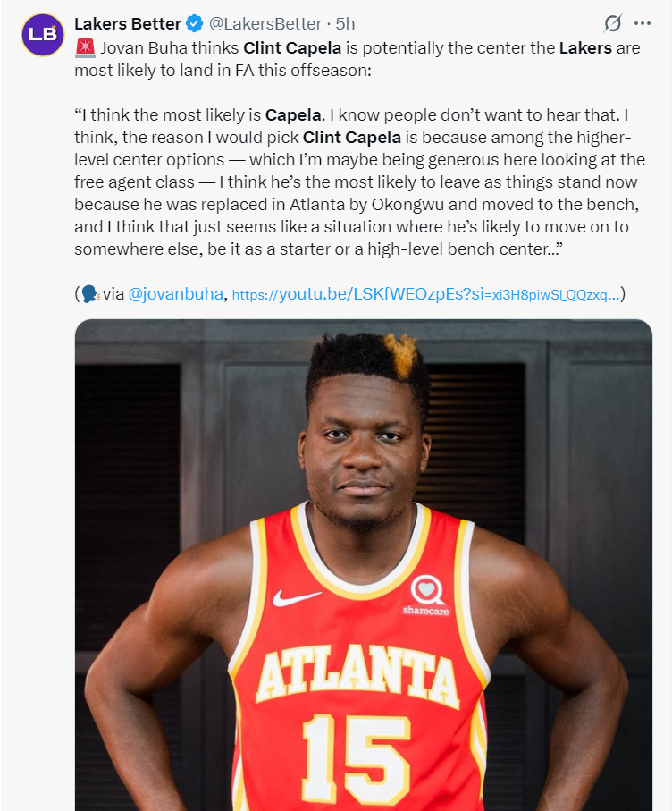 除此之外,湖人在自由市场上最容易获得的中锋人选是克林特-卡佩拉,他在老鹰已经没有位置,而且竞争对手高管已经明确表态卡佩拉失去了先发中锋的能力,他的身价也随着被打入老鹰替补暴跌,湖人用570万的迷你中产就可以引进他。